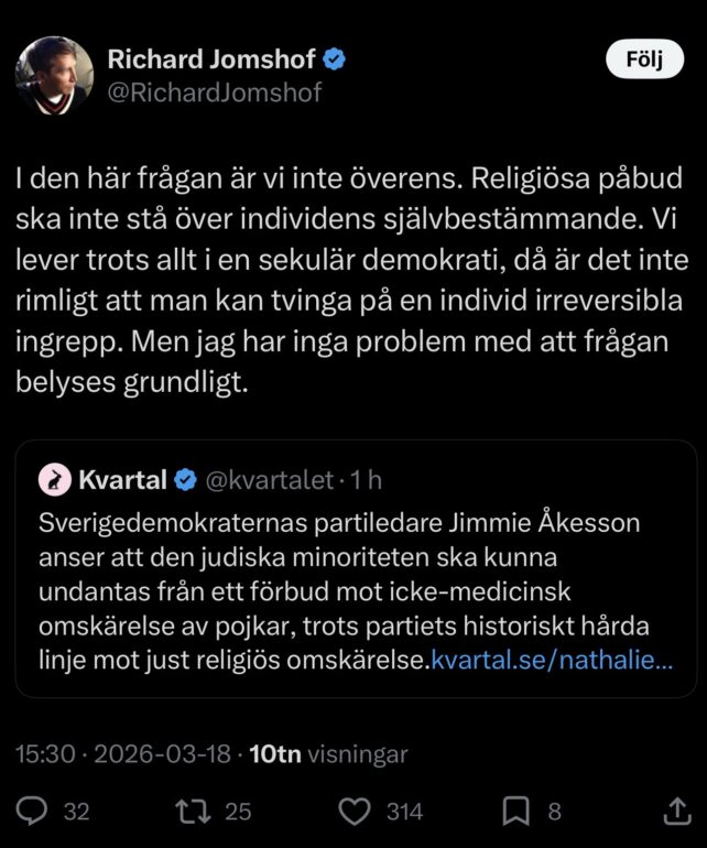 Lideri i partisë suedeze SD, Jimmie Åkesson, ka propozuar që hebrenjtë të përjashtohen nga një ndalim i mundshëm për synetin jo-mjekësor. Lajmi është raportuar nga Kvartal.